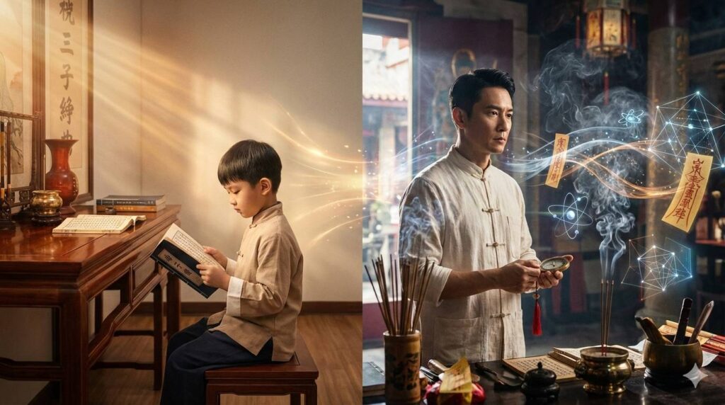 許峻榮成長於一個傳統而嚴謹的 一貫道家庭,從小接觸弟子規與三字經、戒律與心性修養,重視的是修心、積德與種善因。