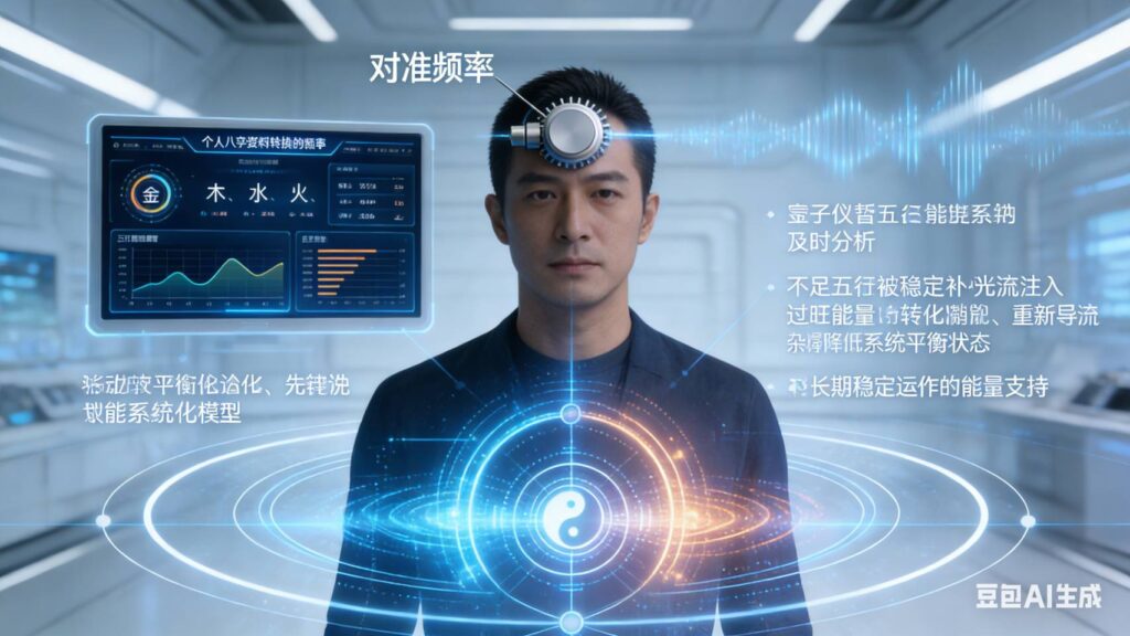 透過八字分析,他會先判斷個人五行強弱與陰陽偏向,再利用 量子儀器進行頻率校準與能量導入,打造專屬於個人的科技能量生基設定,讓缺乏的五行能量能被補足、過旺的能量逐步平衡。